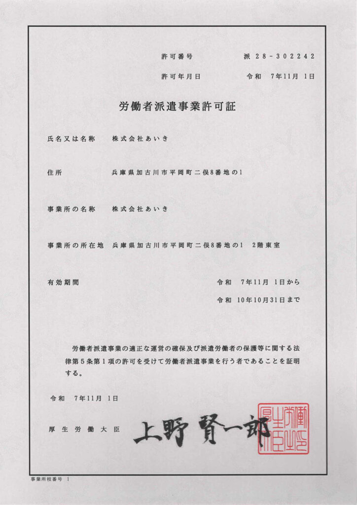 お知らせ 労働者派遣事業許可を取得しました。 株式会社あいきはこの度、厚生労働省より労働者派遣事業許可を取得いたしました。関係諸法令の遵守及び、労働者派遣事業の適正な運営に努めてまいります。 許可概要許可年月日:令和7年11月1日許可番号:派 28-302242